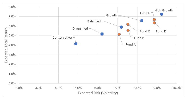 Efficiency tool: Perpetual Private Investment Research team. Industry superannuation fund asset allocations sourced from Xplan/IRESS and are subject to change. Expected risk and return figures are calculated from the asset allocation for each portfolio and risk/return estimates for each underlying asset class. The individual asset class assumptions are projections based on a combination of historical and forward-looking data, such as bond and dividend yield, earnings growth trends and valuation considerations.
