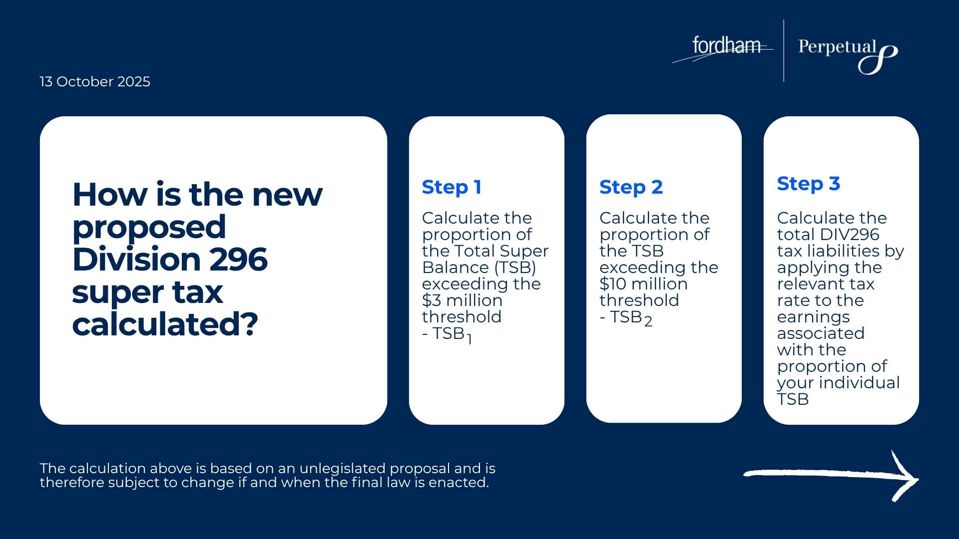 If you are likely to be impacted by the proposed Division 296 tax, then absolutely. At Perpetual, our financial advisers work closely with our colleagues in our Fordham Business Advisors team. Fordham Business Advisors is a specialist business providing clients with accounting, taxation and business advisory services. This ensures a coordinated approach that delivers the best outcome for your specific circumstances.